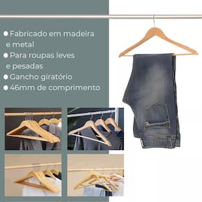O conjunto de cabides de madeira destaca-se como uma opção elegante e prática para manter suas roupas organizadas no armário. Com uma estrutura sólida, oferece durabilidade e proteção contra amassados e marcas do gancho.