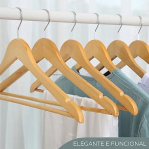 O conjunto de cabides de madeira destaca-se como uma opção elegante e prática para manter suas roupas organizadas no armário. Com uma estrutura sólida, oferece durabilidade e proteção contra amassados e marcas do gancho.