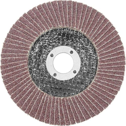 Disco de desbaste tipo flap sextavado e feito de lixas retangulares na base de tecido que são situadas como um leque com fibra de vidro como material de base. utilizado em trabalhos de polimento de metal, madeira e outros materiais.