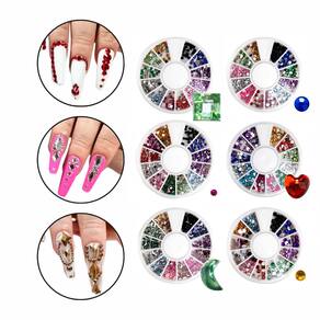 Nosso Kit de 12 Discos de Strass veio para diversificar os designs de unha, tendo 12 cores por disco, e 12 formas diferentes, como: três tamanhos de Bolinhas, Flor, Coração, Estrela, Gota, Lua, Quadrado, Retângulo, Triângulo, Folha…