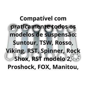 Kit com 6 chaves combinandas totalizando 12 modelos para suspensão de bike O mais completo do mercado Compatível com praticamente todos os modelos de suspensão: Suntour, tsw, rosso, viking, rst, spinner, rock shox, rst modelo 2, proshock, fox, manitou, Comprimento ideal para o manuseio de 150mm Espessura de 5mm, proporcionando uma ferramenta de maior resistência. Produto em aço com alta dureza e resistência, tratamento superficial eletrolítico que não permite que a ferramenta sofra oxidação. Produto cortado a laser garantindo o melhor ajuste e desempenho Excelente qualidade e durabilidade - qual o valor do - qual o prazo de entrega - tem Garantimos o produto num período de 12 meses contra defeitos de fabricação. Vale lembrar que a não cobre mau uso do produto. Marca: Não Informado Ean: 79000371047864