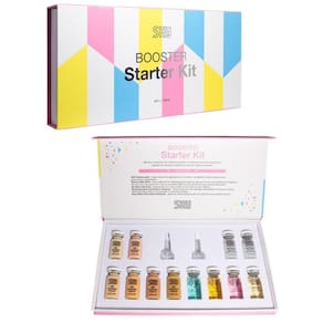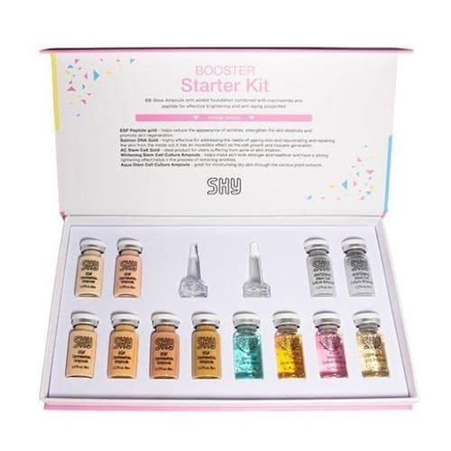 NO.1 Peptide Gold Ampoule: O produto no topo é rotulado como NO.1 Peptide Gold Ampoule. Contém ingredientes PDRN extraídos do sêmen do salmão, que têm efeitos regenerativos e anti-inflamatórios para a pele. Diferentes peptídeos melhoram as rugas e aumentam a firmeza da pele. NO.2 Peptide Gold Ampoule: O segundo produto é rotulado como NO.2 Peptide Gold Ampoule. Contém 99,9% de pó de ouro puro, juntamente com diferentes peptídeos como niacinamida para ajudar a iluminar a pele, e adenosina para reduzir as rugas. NO.3 Aqua Stem Cell Culture Ampoule: Este produto está em um frasco branco e é rotulado como Whitening Stem Cell Culture Ampoule. Contém vários extratos de células-tronco vegetais, peptídeos e niacinamida. Esses ingredientes ajudam a reduzir rugas e clarear a pele, melhorando sua elasticidade e suavidade. NO.4 Aqua Stem Cell Culture Ampoule: Este produto está em um frasco rosa e é rotulado como Aqua Stem Cell Culture Ampoule. Hidrata a pele seca através dos vários extratos vegetais presentes na fórmula. O ácido hialurônico ajuda a manter a pele fresca, hidratada ao reter a umidade, atuando como hidratante e umectante. NO.5 AC Stem Cell Gold Ampoule: Este produto está em um frasco azul-turquesa e é rotulado como AC Stem Cell Gold Ampoule. É ideal para pessoas com acne ou irritação da pele. Contém acetilhexapeptídeo-8 que aumenta a elasticidade da pele e oferece benefícios anti-inflamatórios, antibacterianos, regenerativos para a pele e cura de feridas.