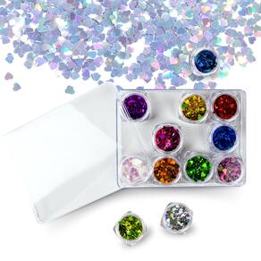 Características Principais: - Mini corações holográficos; - Podem ser utilizadas em todas as técnicas de unhas; - Possuem potes individuais; - Acompanha caixinha com tampa para armazenar os potes individuais; - Agrega elegância e beleza; - Refletem brilho, com cores diferentes a cada ângulo.