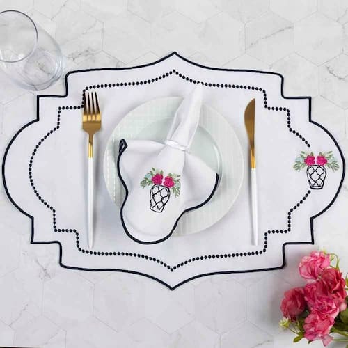 Complete e enriqueça o visual da sua mesa com a Linha Jogo Americano Bordado . Seja para um jantar formal, um brunch descontraído ou qualquer outra ocasião, este jogo americano será o complemento ideal, refletindo seu gosto refinado e sua apreciação pela beleza nas pequenas coisas.