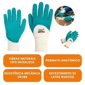 Luva de segurança confeccionada em fibras naturais tipo interlock, revestimento da face palmar, ponta dos dedos e dorso dos dedos em látex corrugado, punho de malha costurado.