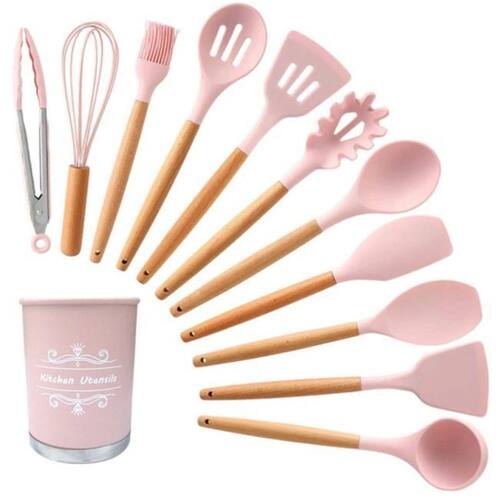 Kit 12 Peças de Utensílios em Silicone Cor: Rosa Conjunto Utensílios para Cozinha de Silicone 12 peças Cada uma das peças é única e representa tudo o que você precisa para preparar todos e mais variados pratos . Conjunto de utensílios de cozinha de silicone profissional inclui 11 peças diferentes mais balde de suporte.