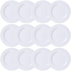 Garantia: 90 dias / Peso total: 8,016 / Cor predominante: branco / Ref: 7794463603894 Dimensões de cada: 27cm (D) x 2,6cm (A); Material: porcelana; Tipo: raso; Formato: aba larga; Conteúdo: 12 pratos de porcelana: Cuidados: - Este produto não pode ser levado ao forno ou entrar em contato com chama de fogão; - Limpar com água e sabão neutro utilizando esponja macia, seguido de pano seco; - Não utilizar produtos químicos ou abrasivos na limpeza; - Evitar batidas e contato com objetos cortantes; - Resistente ao micro-ondas e a lava louças.