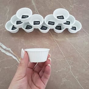 Dimensões de cada ramekin: 5,7cm (D) x 2,5cm (A);