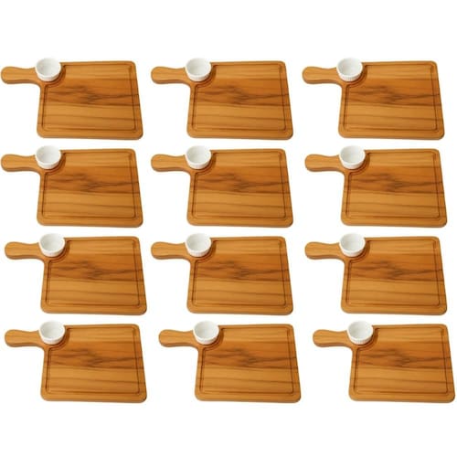 Kit 12 Tábuas Teca 35x22cm com Molheira 30ml para Servir Hambúrguer Petisqueira Zanline.