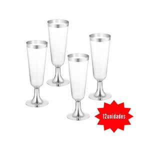 Kit 12 Taças De Champanhe Em Plástico Com Borda Prata 150Ml