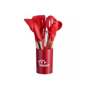 Kit 12 Utensílios de Cozinha em Silicone Cabo de Madeira Resistente ao Calor - Vermelho