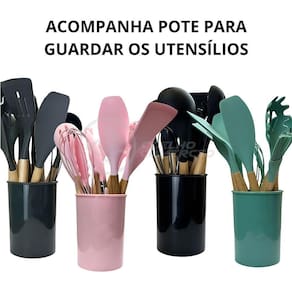 Nosso kit é composto por 12 utensílios essenciais para qualquer cozinha: espátula perfurada, concha, pegador de espaguete, colher perfurada, espátula para wok, espátula de colher, colher sólida, espátula pontuda, pinças, batedor e pincel de confeiteiro. Cada utensílio é feito de silicone premium, para superfícies antiaderentes e com cabos de madeira ergonômicos que proporcionam conforto durante o uso. Além disso, o kit inclui um pote elegante para armazenar todos os utensílios, mantendo sua cozinha organizada e estilosa.