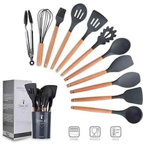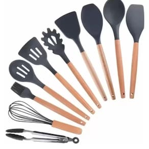 O kit 12 utensílios de cozinha em silicone e cabo de madeira vem com tudo que você mais precisa para cozinhar suas receitas com enorme facilidade e praticidade