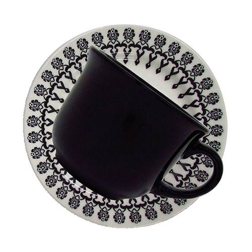 A cor preta é básica e neutra, um verdadeiro curinga na hora de montar a mesa. Nessa louça, colocamos a cor preta numa estampa mais alegre e jovial, perfeita para quem prefere um formato de pratos tradicional com uma decoração mais alegre. A xícara preta, sem decoração, cria uma linda composição com as demais peças.