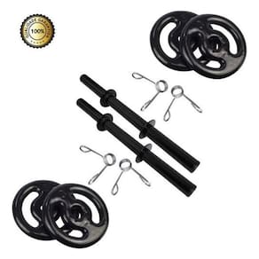 Kit composto por: - par de barra oca 40 cm + presilha - 24 kg de anilhas emborrachadas