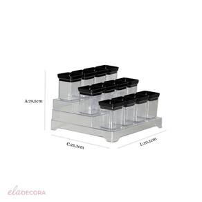 Kit 13 Porta Temperos Lumini Black Decorativo Organizador Descrição do ProdutoO Kit Porta Temperos Lumini é a solução perfeita para quem busca praticidade e organização na cozinha. Composto por 12 mini potes e 1 suporte, esse conjunto oferece um design elegante e funcional, além de contar com uma tampa preta que proporciona um toque de sofisticação ao ambiente. Características do ProdutoMedidas:Comprimento: 25,3cmLargura: 10,1cmAltura: 29,5cm Especificações:Material: PoliestirenoCor/acabamento: Transparente/PretoCapacidade: 180ml Itens Inclusos:1 Suporte Acrílico e 12 Porta Temperos
