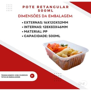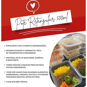 LOJA OFICIAL EMBANET. Pote Retangular 500ml tornando sua rotina mais ágil, aumentando a vida útil de alimentos. Embalagens resistente ao frio e ao calor, vão direto do freezer ao micro-ondas sem deformar ou contaminar os alimentos preservando o aroma e o sabor. Oferece espaço suficiente para armazenar suas refeições, desde saladas, massas, carnes, legumes e outros pratos. Traz diversos benefícios e diferenciais. Seja para levar suas refeições ao trabalho, escola, academia ou viagens, esse pote é uma opção prática e saudável. Ele ajuda você a se manter na dieta, controlar as porções e economizar dinheiro ao preparar suas próprias refeições. Outro diferencial do pote marmita é sua versatilidade. Além de armazenar alimentos, ele também pode ser para guardar sobremesas, lanches, frutas, snacks e até mesmo pequenos objetos, como bijuterias, medicamentos, entre outros. Itens Inclusos: 144 unidades de potes 144 unidades de Tampas Especificações: Medidas externas: 164x120x52mm Medidas internas: 128x83x46mm Material: PP Capacidade: 500ml Na EMBANET você encontra materiais de alta performance, durabilidade e ótimo acabamento, não tóxico e ecologicamente correto. Oferecendo um ótimo custo benefício. Realizamos o envio de forma rápida e segura, para que receba seu produto em perfeitas condições, evitando problemas ou danos durante o transporte. Garantindo qualidade e satisfação aos nossos clientes. Trabalhamos com diversos tipos de embalagens. Veja mais anúncios do vendedor. Marca: Não Informado