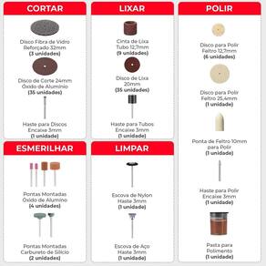Kit com 150 Acessórios para Micro Retífica Completo Dremax. indicado para lixar, polir, cortar, esmerilhar, limpar, gravar, desbastar, furar, etc. - Marca: Dremax - Modelo: KA-150 - Kit completo com 150 peças para lixar, polir, esmerilhar, limpar, gravar, desbastar e furar - Hastes de 3mm padrão de todas as micro retíficas - Uso em micro retíficas de qualquer marca - Peso bruto: 250 gramas - : 90 dias contra defeitos de fabricação Itens Inclusos: - 18 Discos de Corte 32mm Reforçados - 30 pontas diamantadas com pontas de diferentes formatos - 35 Discos De Corte 24mm - 35 Discos De Lixa 20mm - 9 Tubos De Lixa 12,7mm - 1 Disco de Polimento 25,4mm - 6 Discos de Polimento 12,7mm - 1 Ponta de Feltro 10mm - 1 Ponta Montada 10mm Carboneto de Silício verde - 1 Ponta Montada 20mm Carboneto de Silício verde - 1 Ponta Montada 9,5mm Óxido de Alumínio laranja - 1 Ponta Montada 14,3mm Óxido de Alumínio laranja - 1 Ponta Montada 6mm Óxido de Alumínio rosa - 1 Ponta Montada 6mm Arredondada Óxido de Alumínio rosa - 1 Escova Copo 12mm Aço - 1 Escova 20mm Nylon - 1 Suporte para Tubo de Lixa 12,7mm - 1 Suporte para Discos de Corte e Lixa - 1 Suporte para Disco de Feltro - 1 Pasta de Polimento - 1 Pedra para Afiar - 2 Potes Plásticos Marca: Não Informado