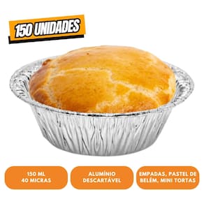 Forma descartável de alumínio para empadas, embalagem com 150 unidades. Própria para empadas, pastel de belém, bolinhos, mini tortas, quindim, quiches e quitutes diversos.