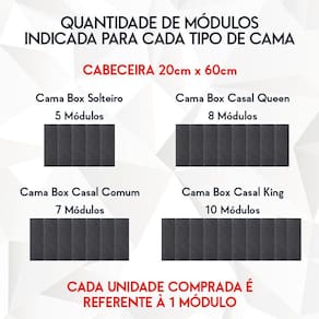- 1 Módulo tem o tamanho de 20cm x 60cm- Espessura de 4,0cm- Revestimento em MDF e Tecido Almofadado- Tecido: Suede Veludo- Acompanham Fita Adesiva para Fixação