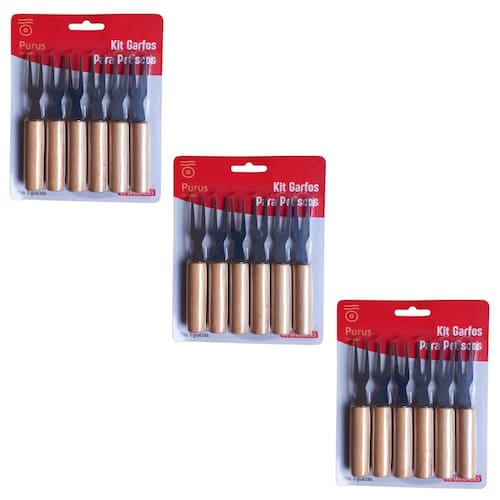 Unidades no Kit: 18 Garfinhos Tamanho Total do Garfinho: 11 cm Tamanho do Cabo de Madeira: 5,5 cm Material de Fabricação: Aço Inox e Madeira