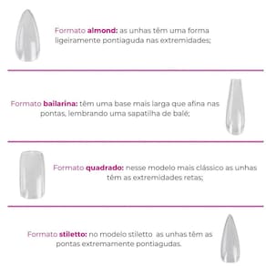 Contém: 48 - Unhas de plástico PVC transparente formato almond; 48 - Unhas de plástico PVC transparente formato bailarina; 48 - Unhas de plástico PVC transparente formato quadrado; 48 - Unhas de plástico PVC transparente formato stiletto.