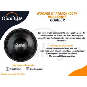 Conteúdo da embalagem: • 2 BOMBER Atrack 12" 4 Ohms 400 Wrms • Manual do usuário • Certificado de garantia
