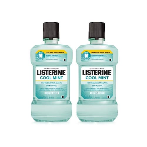 O Kit contém: 2 Antissépticos Bucal Listerine Cool Mint Refrescância Suave 500ml.