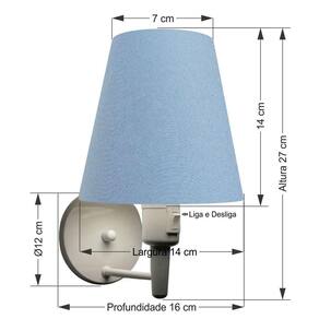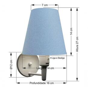 Kit/2 Arandela de parede Cone Md-2013 Branca C/ Inter Liga e Desl Cúpula Tecido Azul BebêAs arandelas Lustres Vivare são elementos versáteis e elegantes que podem transformar qualquer ambiente em um espaço cheio de estilo. Seja para adicionar uma iluminação suave, destacar uma parede ou criar um efeito de luz diferenciado.Dimensão:Cúpula em Tecido: 14x07x14cm