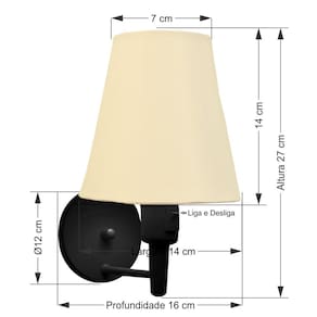 Kit/2 Arandela de parede Cone Md-2013 Preto C/ Inter Liga e Desl Cúpula Tecido Algodão CrúAs arandelas Lustres Vivare são elementos versáteis e elegantes que podem transformar qualquer ambiente em um espaço cheio de estilo. Seja para adicionar uma iluminação suave, destacar uma parede ou criar um efeito de luz diferenciado.Dimensão:Cúpula em Tecido: 14x07x14cm Arandela de parede Montada: Altura 27cm Largura 14cm Profundidade 16cm Formato: Cone Tamanho: Pequeno Especificação:Material: Cúpula em Tecido Estrutura em Alumínio Base Parede: Diâmetro 11x1,2cm Resistente: Á Maresia Voltagem: 110V/220V Liga e Desliga: Interruptor no Soquete Tipo de Soquete: E27 Tipo de Lâmpada: Led Bulbo até 16w ou Fluorescente Espiral até 25w Cada Capacidade de Lâmpadas: 1 Observação:Acompanha Lâmpada: Não Possui Led Integrado: Não Garantia: 12 Meses Manual de Instalação: Sim Arandela de parede Montada: Sim Controle de Luminosidade: Não Tipo de Embalagem: Caixa Conservação e Manutenção do Produto:A Limpeza deve ser realizada com o produto desligado. Remova o lustre que pode ser lavado com sabão neutro. Nunca utilize produtos químicos e abrasivos Antes de comprar o seu produto verifique as medidas, o local onde pretende instalar e se necessário o serviço de um profissional qualificado.