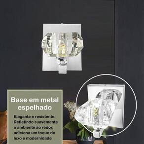 Descrição: - Materiais: metal e cristal k9. - Dimensões do cristal CxLxA : 7 cm x 7 cm x 4 cm - Dimensões da base: Altura: 12 cm Largura: 10 cm Profundidade: 2 cm - Profundidade total da arandela: 10 cm
