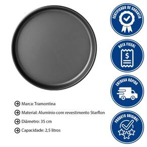 DESCRIÇÃO DA ASSADEIRA PARA PIZZA - Pode chamar os amigos e colocar a mão na massa! - Com a assadeira para pizza Tramontina Brasil em alumínio com revestimento interno e externo antiaderente Starflon Max grafite 35 centímetros de diâmetro 2,5 litros as reuniões entre amigos serão regadas de muita pizza. - Perfeita para assar e servir suas melhores receitas, ela é produzida em alumínio com revestimento interno e externo em antiaderente Starflon Max, permitindo que a pizza asse de maneira rápida e uniforme; além disso, possui maior durabilidade, não deixa os alimentos grudarem e não é prejudicial à saúde. - É superfácil de limpar e pode ir à máquina de lavar louças, tornando a limpeza muito mais fácil. - Garanta mais sabor e praticidade em sua cozinha!