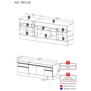 Dimensões do produto montado: Altura: 84cm | Largura: 220cm | Profundidade: 53cm (balcão com tampo) *Você pode consultar as medidas internas na imagem técnica do produto. *As cores do produto podem sofrer variações de tonalidade de acordo com as configurações do seu dispositivo.