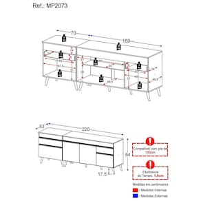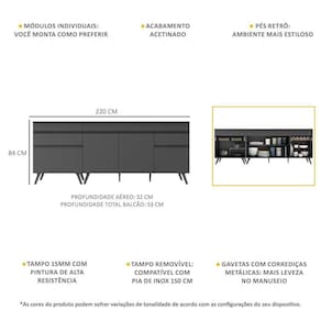 Altura: 84cm | Largura: 220cm | Profundidade: 53cm (balcão com tampo)