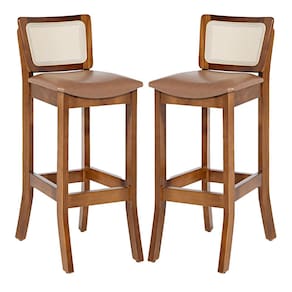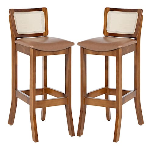CARACTERÍSTICAS TÉCNICAS: - Produzido em Madeira Maciça Sustentável - Acabamento em Verniz na cor Imbuia - Encosto com Revestimento em Rattan com Fibra Sintética Quadriculada na cor Bege - Assento Estofado Preenchido com Espuma D23 - Assento com Revestimento em Tecido Impermeável na cor Caramelo L85 - Banqueta Entregue Montada *Kit Composto por DUAS Banquetas
