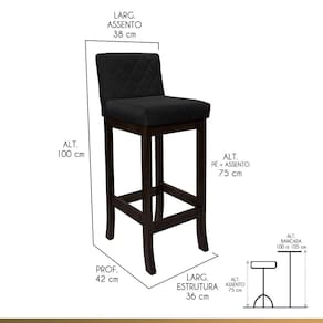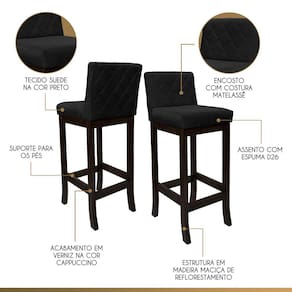 A banqueta Tóquio é a fusão perfeita entre requinte e comodidade. Fabricada com madeira maciça proveniente de reflorestamento e acabamento em verniz, sua estrutura promove durabilidade e um charme natural. O assento, preenchido com espuma D26, e o encosto, com espuma D23, proporcionam um suporte ergonômico incomparável. O toque de elegância é evidenciado pelo detalhe da costura matelassê no encosto, enquanto o revestimento em suede adiciona um acabamento luxuoso. A banqueta Tóquio é a escolha ideal para elevar o conforto e a sofisticação de qualquer ambiente. CARACTERÍTICAS TÉCNICAS: - Produzido em Madeira Maciça de Reflorestamento; - Acabamento em Verniz na cor Capuccino; - Assento Preenchido com Espuma D26; - Encosto Preenchido com Espuma D23; - Encosto com Costura Matelassê; - Revestimento em Suede na cor Preto. *Indicada para Bancadas/Mesas com Alt. 100/105cm. *PRODUTO ENVIADO MONTADO. INFORMAÇÕES TÉCNICAS: Altura Total: 100 Cm Altura até Assento: 75 Cm Altura até Travessa: 23 Cm Altura Encosto: 35 Cm Largura Assento: 38 Cm Largura Estrutura: 36 Cm Profundidade Total: 42 Cm Profundidade Assento: 41 Cm Peso: 7 kg * Kit Composto por 2 Banquetas Tóquio. INFORMAÇÕES ADICIONAIS: ATENÇÃO: Móvel produzido em madeira maciça natural podendo ocorrer mudança no tom da madeira conforme o produto. *Conferir se o produto está de acordo com o que comprou, produto danificado não será aceito troca. **As imagens ambientadas são meramente ilustrativas e podem apresentar itens que não compõe o produto. As cores do produto podem variar de acordo com o monitor, a iluminação do ambiente ou sua percepção visual. ***Limpeza deve ser feita com pano macio e seco ou levemente umedecido com água e sabão neutro. Não devem ser utilizados produtos abrasivos. Garantia para defeitos de fabricação conforme Código de Defesa do Consumidor. Marca: CCS Interiores