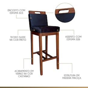 Descubra a sofisticação e conforto da Banqueta Alta Veneza! Feita em Madeira Maciça com acabamento em Verniz Castanho, possui assento e encosto preenchidos com espuma D26 e D23, respectivamente. Seu revestimento em Tecido Suede Preto adiciona elegância ao design. Leve esta peça única para seu lar e desfrute de sua beleza e qualidade excepcionais. Aproveite o conforto e estilo que ela oferece em seus momentos especiais!