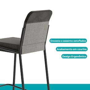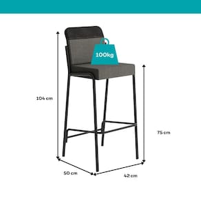 Especificações Banqueta: Medidas: Largura: 42 cm | Altura: 104 cm | Profundidade: 50 cm Altura até o assento: 75 cm Peso: 12,60 Kg Estrutura: Tubos de aço Assento: Estofado Encosto: Estofado Montagem: Soldada Ponteira: Plástica Peso suportado: Até 100 Kg