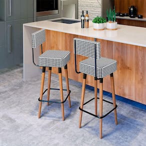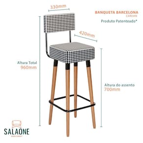 A banqueta Barcelona, possui 04 pés de madeira eucalipto com 60 cm de altura, e encosto estruturado, com seu design moderno, pode ser utilizada em sua área gourmet, área externa.