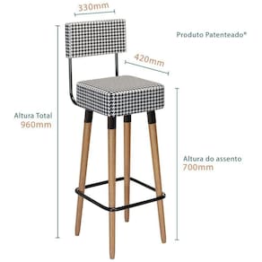 Características Gerais do Produto: - Acabamento: Linha Premium - Altura: 96 cm - Ideal para: Cozinha/Churrasqueira - Informações Adicionais: Altura para apoio dos pés 20 cm - Largura: 33 cm - Material: Aço/Madeira/Mdf/Espuma - Peso Suportado: 110 kg - Pintura: Espuma D-28 no assento - Profundidade: 42 cm - Tipo de Pé: 60 cm de Madeira - Informações Adicionais: - Não nos responsabilizamos pela montagem dos produtos. Todos os produtos acompanham acessórios para que sejam montados. - Não nos responsabilizamos, no ato da entrega, por subir escadas/elevadores ou transporte por guincho em apartamentos. - Eventuais despesas são de responsabilidade do comprador - Confira as dimensões deste produto e certifique-se de que passará normalmente por supostos elevadores, portas, escadas e/ou corredores de sua residência - Não aceitamos devolução de produtos com caixas violadas ou materiais danificados, confira a quantidade de volumes e se o que está sendo entregue corresponde com a mercadoria adquirida, não aceitamos devolução após o prazo de arrependimento de 7 dias corridos.