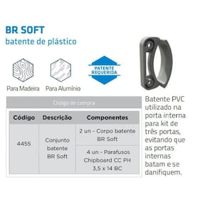 BR SoftBatente de plástico utilizado principalmente em portas de armário de correr, evitando que as portas batam e se danifiquem.Observações importantesO BR Soft foi desenvolvido para ser instalado em móveis com 3 ou mais portas, onde 2 ou mais portas possam se bater lateralmente por correrem no mesmo vão .É recomendado o uso de no mínimo 2 batentes em móveis com 3 portas .Modo de instalaçãoEncoste o fixe do BR Soft na porta descontando 150mm da base no batente a ser instalado na parte inferior da porta e 150mm do topo no batente a ser instalado na parte superior da porta. Em caso da necessidade de mais batentes dividir por igual no espaço restante entre os batentes inicialmente instalados para instalação dos outros.ComposiçãoMaterial: Plástico / PVCAcompanha parafusos: sim 4 un 3,5 x 14mm Instalação: Sobrepor Não há necessidade de usinar a porta e pode ser instalado em qualquer móvel de correr já existente