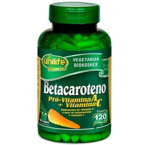 Betacaroteno da Unilife Vitamins é um suplemento em cápsulas à base de betacaroteno pró-vitamina A e vitamina C.