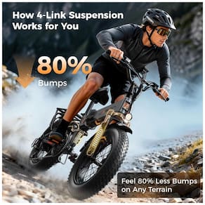 A X-Hunter utiliza motor traseiro brushless com até 1400W de potência de pico e bateria de 48V 13Ah (624Wh), alcançando velocidade máxima próxima de 48 km/h (30+ mph) e autonomia de até cerca de 70 milhas em pedal assistido, adequada para deslocamentos diários mais longos, lazer e percursos mistos. Ambas as bicicletas contam com pneus 20x4 resistentes a furos, garantindo boa tração em areia, neve e terrenos irregulares, e com sistema de suspensão dianteira com garfo de curso ampliado e suspensão traseira em múltiplos pontos, reduzindo impactos e vibrações para maior conforto e controle.