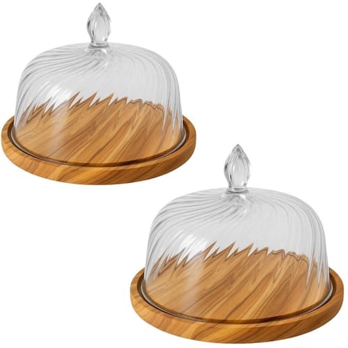 Kit 2 Boleiras de Madeira Teca com Cúpula Plástica 32x20cm Bolos Tortas Zanline.