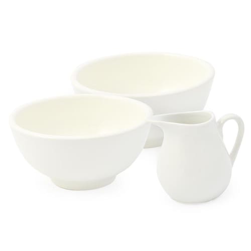 Kit 2 Bowls Tigela e Mini Jarra Para Sobremesas Branco Kit com 3 peças sendo 2 bowls + 1 mini jarra para coberturas, conjunto confeccionado em cerâmica na cor branca, cor coringa que combina com qualquer decoração de mesa posta, uma excelente opção para ter em casa ou para presentear.