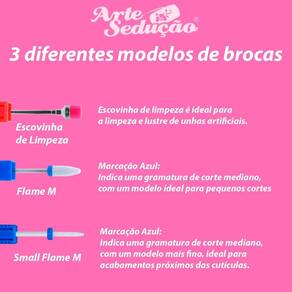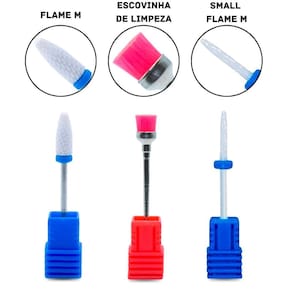 Características: -broca Escovinha: Broca com ponta de escova para limpeza. Leve e resistente ao calor e desgaste. Ideal para a limpeza e lustre de unhas artificiais. Limpa de forma delicada e precisa deixando as unhas limpas e brilhando. -flame F: Broca de gramatura de corte fino, é ideal para modelar, nivelar e esculpir as unhas artificiais; -small Flame M: Broca de gramatura de corte mediano é indicada para realizar pequenos cortes e acabamentos nas proximidades das cutículas das unhas;
