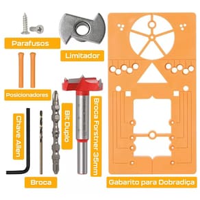 Kit Gabarito com 2 Fresas Broca Forstner 35mm para Dobradiça Caneco com Limitador de Profundidade Completo - Marca: Dremax - Kit com 2 Brocas Forstner e Gabarito para instalação de dobradiças tipo caneco 35mm - Gabarito com escalas claras e precisas, para furação na posição correta - Kit Ideal para instalar dobradiças e outros encaixes em madeiras duras, aglomerados no segmento de móveis e carpintaria - Fresa com dente de vídea/metal duro indicada para trabalhos em madeira e derivados na colocação de dobradiças tipo caneco - Diâmetro do corte: 35mm - Haste diâmetro x comprimento :8 mm x 20 mm / 12 mm x 25 mm - : 90 dias contra defeitos de fabricação Itens inclusos: - 2 Fresas dobradiça tipo caneco 35 mm com 3 dentes - 1 Gabarito para dobradiças caneco - 1 Chave Allen - 1 Limitador de profundidade - 1 Bit ponta dupla - 1 Broca - 2 Parafusos - 2 Haste de posicionamento Marca: Não Informado Ean: 7734625974172