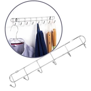 Kit 2 Cabides de Parede Inox com 6 Ganchos 35cm Organizador Maximize o espaço em sua casa com o elegante e funcional Cabideiro de Parede em INOX Cromado. Com seis ganchos robustos, este suporte é ideal para organizar roupas, toalhas, panos, vassouras, rodos, chaves e muito mais. Seu design compacto e resistente o torna perfeito para uso em áreas de espaço limitado como quartos, banheiros e halls de entrada.
