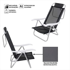 A Cadeira de Praia Reclinável Sunny Bel é um item indispensável para quem adora sol e praia. Desenvolvida com assento mais largo e encosto mais alto, esse modelo proporciona mais conforto e resistência para quem usa. A tela é confeccionada em 100% poliéster com revestimento em PVC e sua estrutura é em alumínio, com tubos mais largos. A Cadeira de Praia Reclinável Sunny Bel suporta um peso de 120kg e reclina até 180º, sendo ideal para descansar, relaxar e tomar sol. Com um design funcional, a cadeira é dobrável e leve, facilitando seu transporte por onde for.