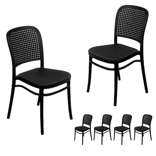 Modelo: Barcelona Cor: Preto Estrutura: Polipropileno resistente de alta qualidade Encosto: Padrão sextavado com proteção UV Peso suportado: até 120 Kg com estabilidade Assento: integrado à estrutura